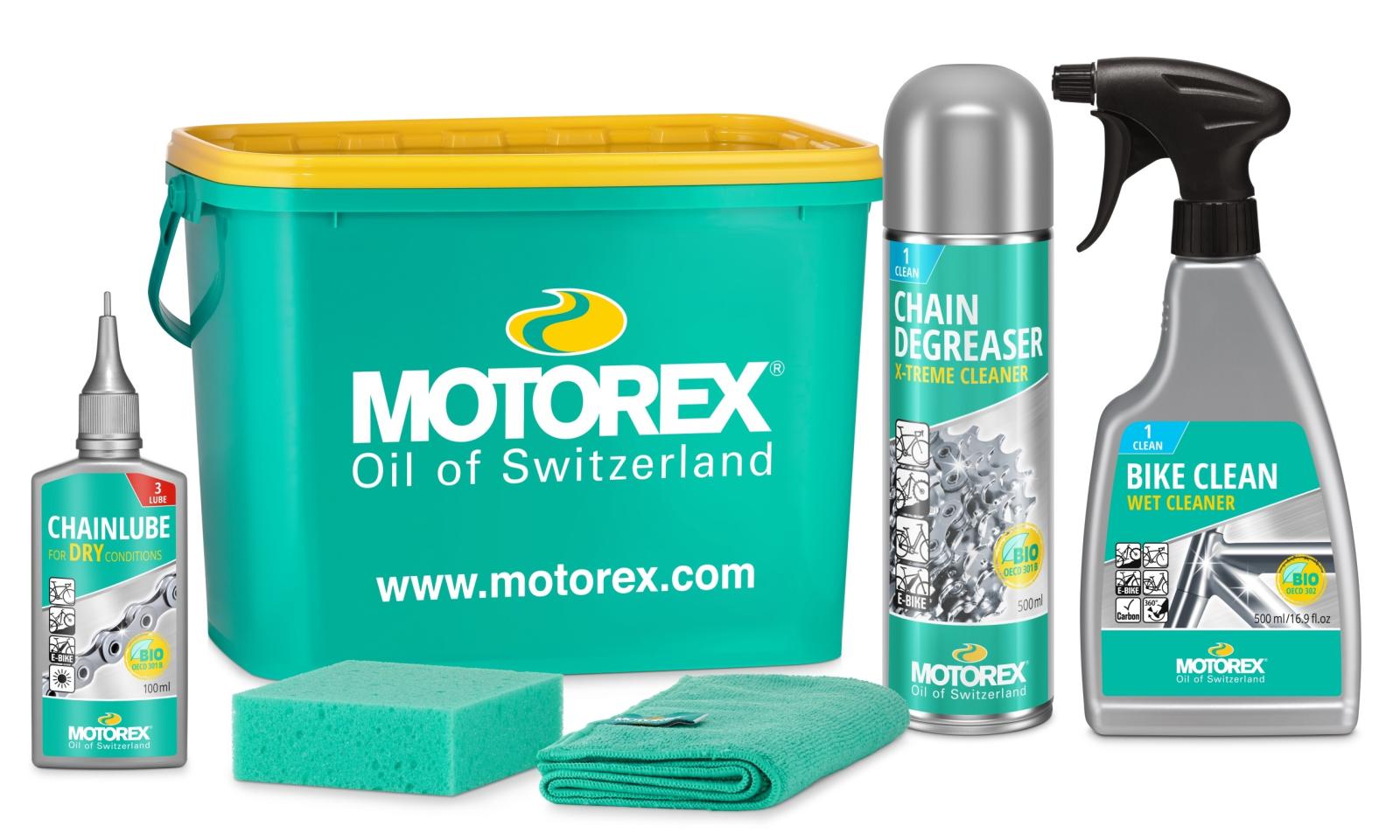 Im praktischen Eimer mit Schwamm und Baumwolllappen, für die einfache und wirksame Pflege. MOTOREX EASY CLEAN 500 ml Spray, Kettenentfetter – MOTOREX BIKE CLEAN 500 ml Zerstäuber, Fahrradreiniger – MOTOREX DRY LUBE 100 ml, Kettenschmiermittel. Unentbehrliches Reinigungskit für Freizeit und Sport.