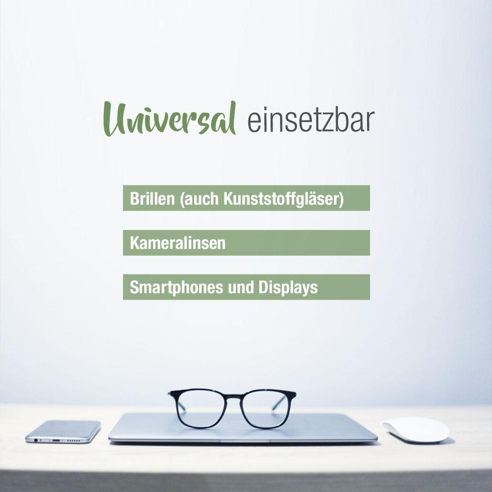 Eignet sich für Brillen und Kameraobjektive aller Art – vor allem auch für Sportbrillen, z. B. beim Fahrrad- oder Skifahren