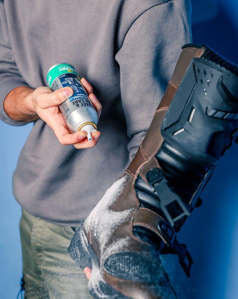 Die bewährte Aktivschaumformel reinigt und frischt nicht nur Helme und sämtliche Protektoren auf, sondern auch Handschuhe und die komplette Schutzausrüstung